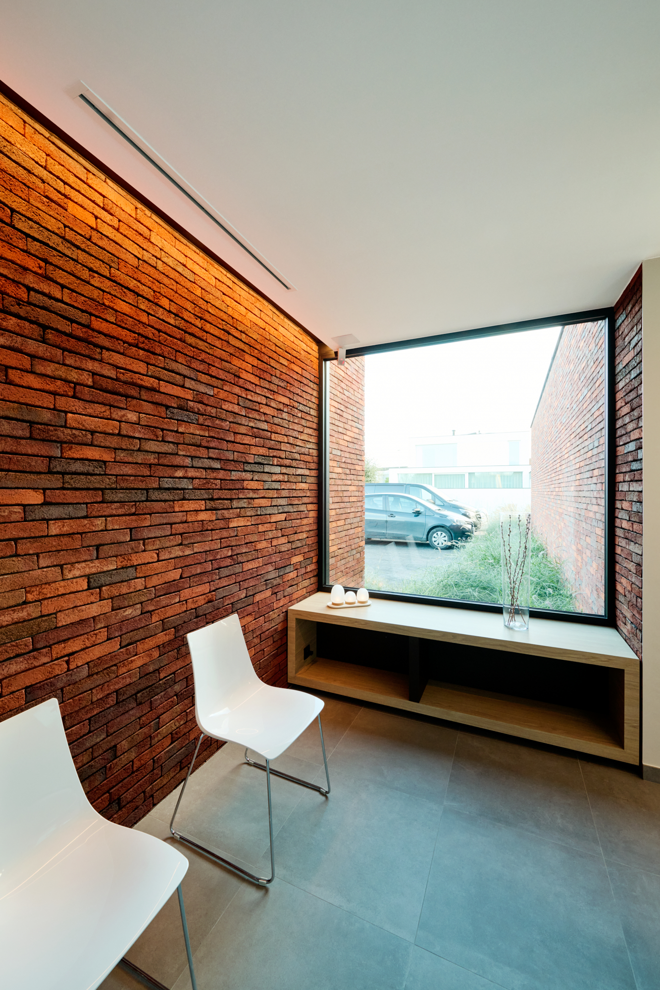 In de inkomhal is de houten (kindvriendelijke) trap het aandachtspunt. Via een accentraam op de verdieping baadt deze ruimte in het licht.