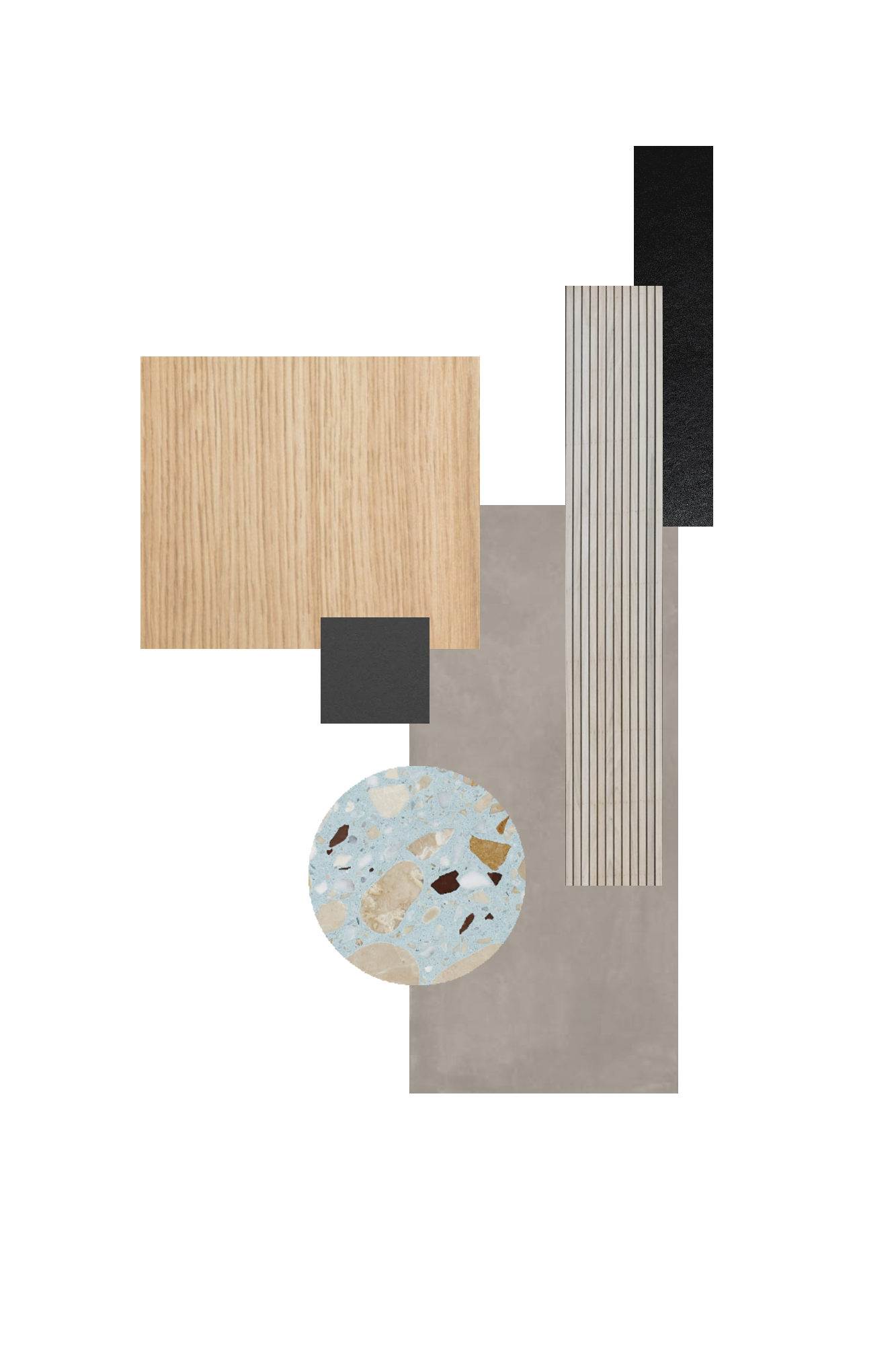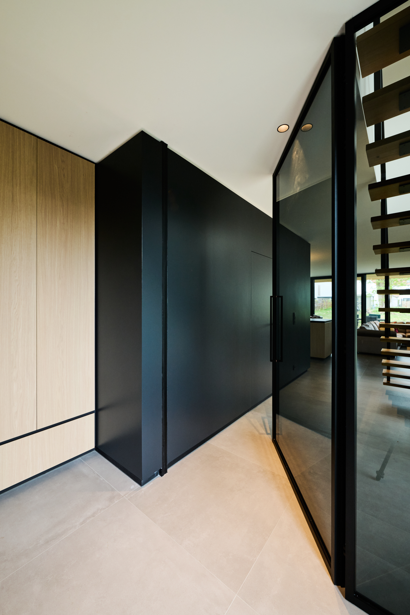 Het resultaat is een helder georganiseerd gelijkvloers, waar de ruime leefruimte zich volledig opent naar de tuin. Boven dit open plan zweeft een houten, uitkragend volume dat de woning haar karakteristieke uitstraling geeft. Aan de straatzijde trekt het de aandacht en leidt het bezoekers richting de overdekte voordeur. Aan de tuinzijde zorgt het voor natuurlijke zonwering boven de royale glaspartij en creëert het een overdekt terras. Binnenin ontstaat een boeiend spel van contrasten: open doorzichten tussen grote glasvlakken en gesloten wanden, afgewisseld met ritmische houten lamellen rondom de patio.