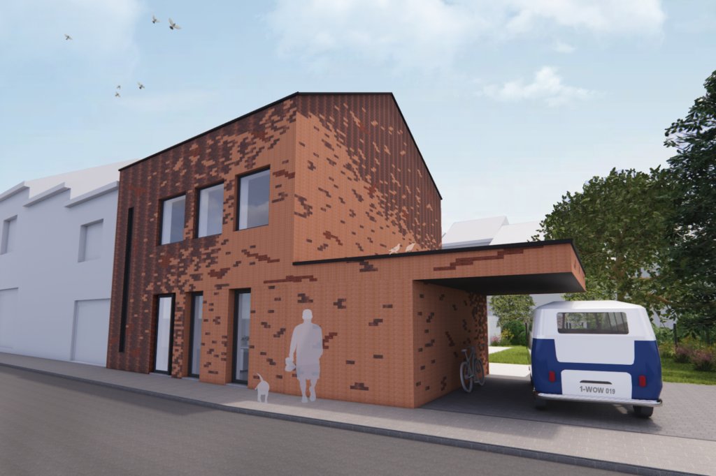 Verbouwen hoeft niet altijd gepaard te gaan met grote volumewijzigingen. Duurzaamheid zit ook in het hergebruik van bestaande materialen. Bij deze energetische renovatie werd enkel de bestaande veranda gesloopt en vervangen door een fietsenberging met carport. Het bestaande hoofdvolume werd volledig onder handen genomen. Een compact beschermd volume werd voorzien van een nieuwe isolatieschil, afgewerkt met steenstrips. Een speelse schakering in natuurlijke baksteentinten zorgt voor een levendig geheel.