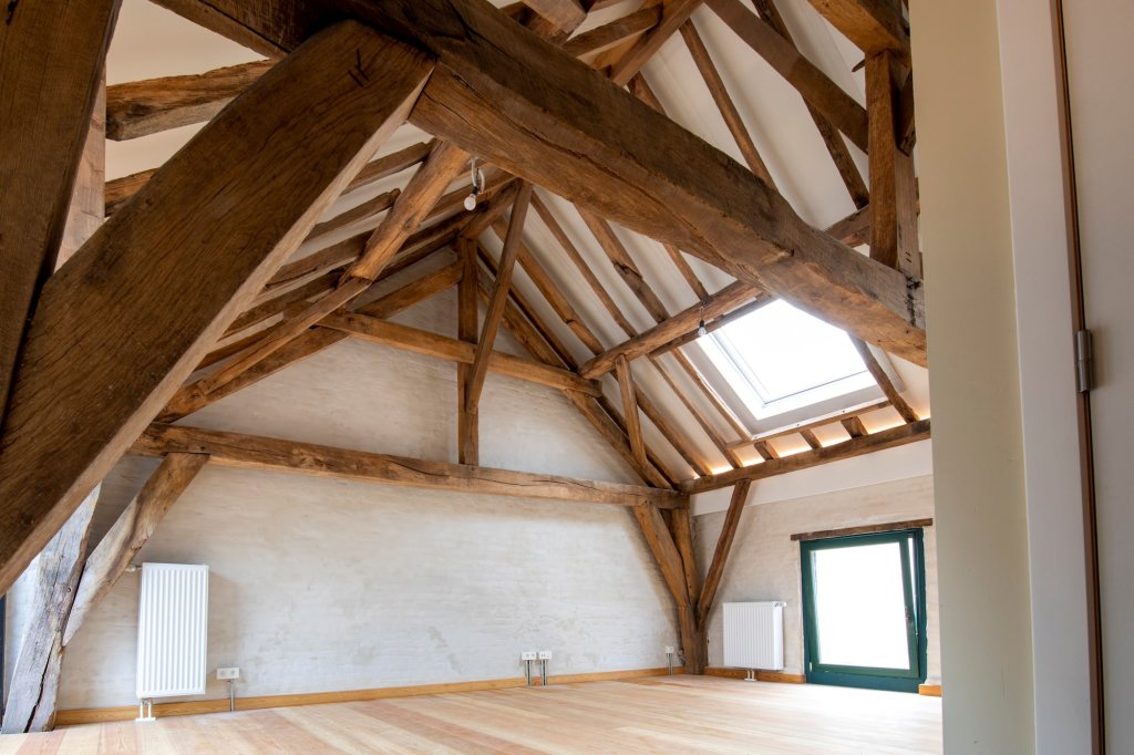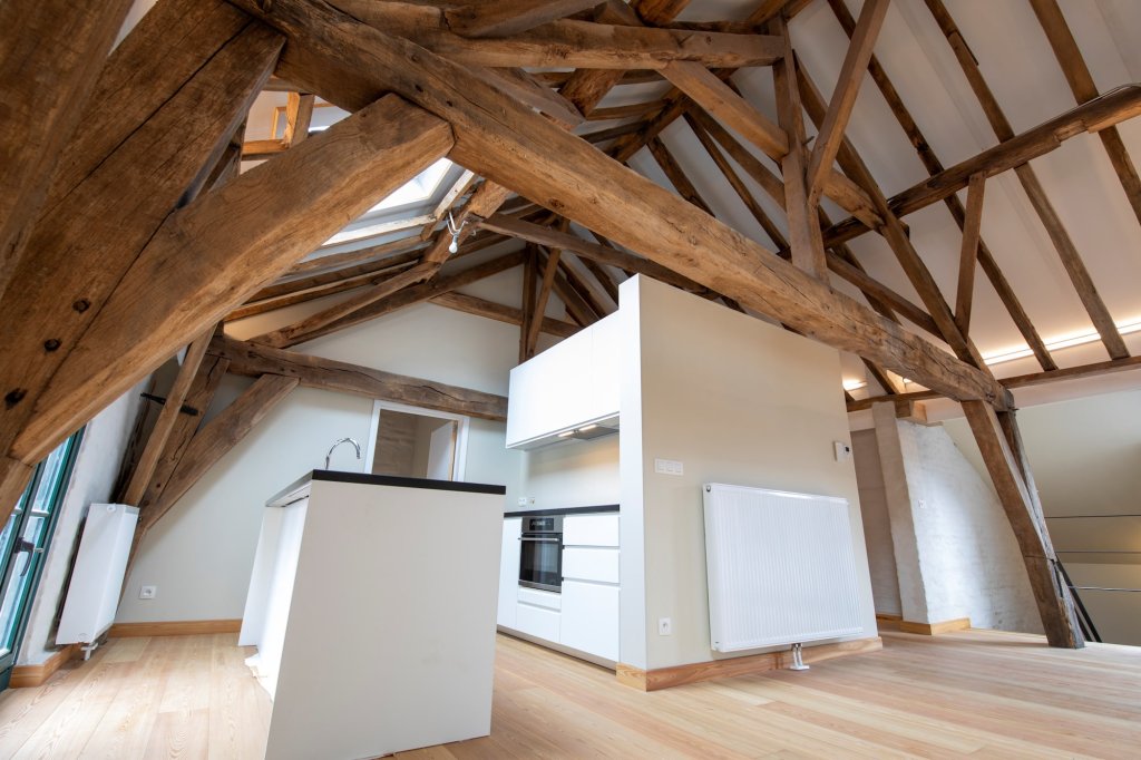 Het fantastische eiken dakgebinte van de vroegere zolder werd het decor voor deze stadsloft.