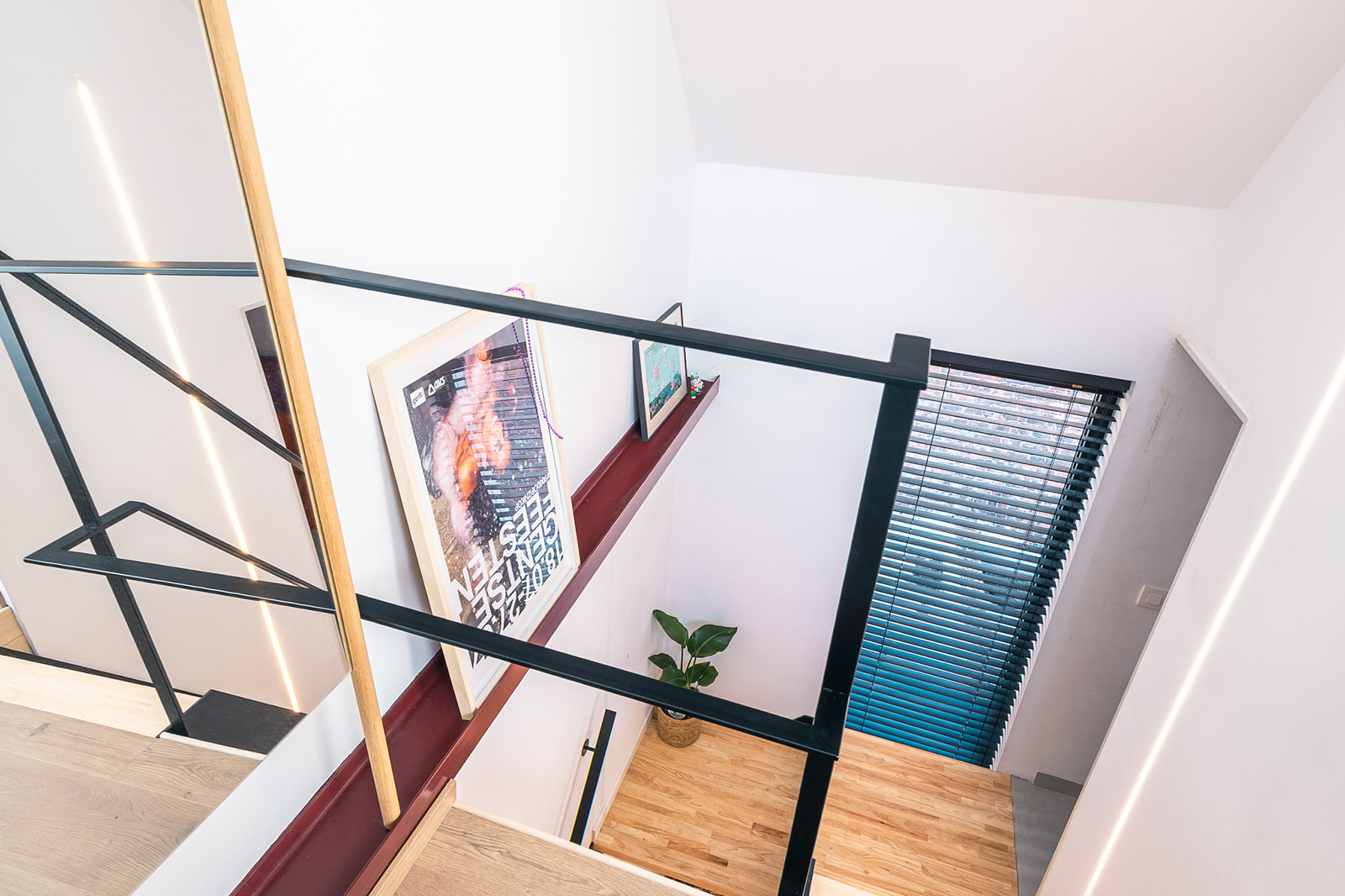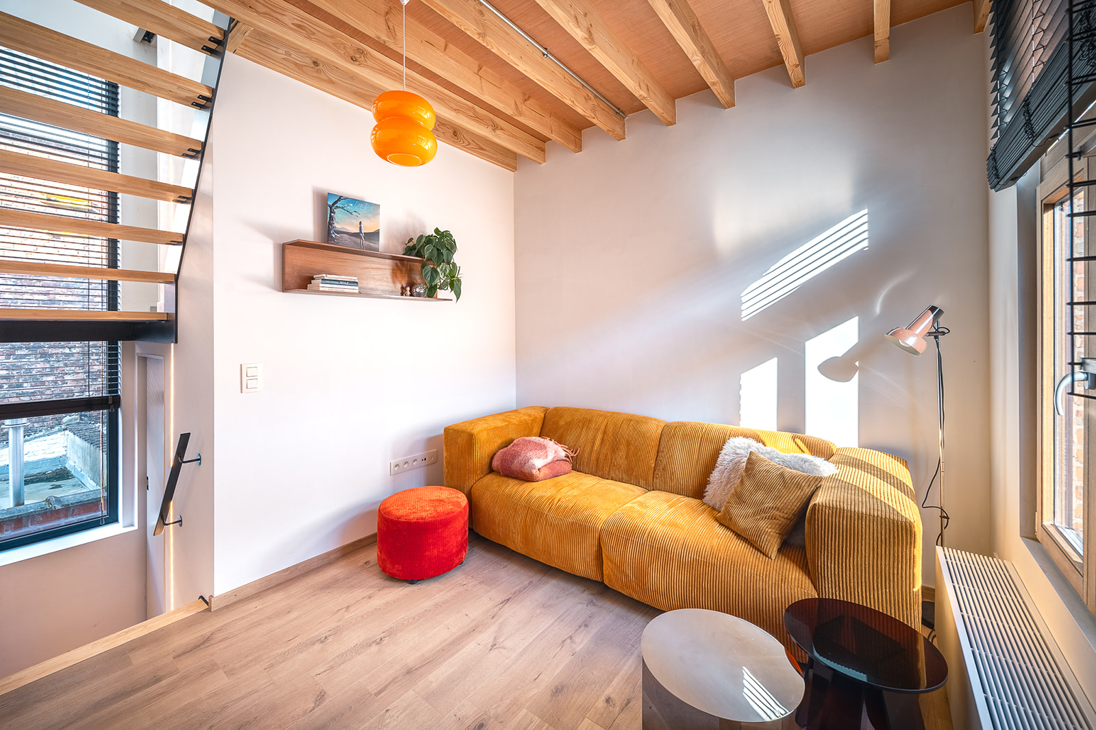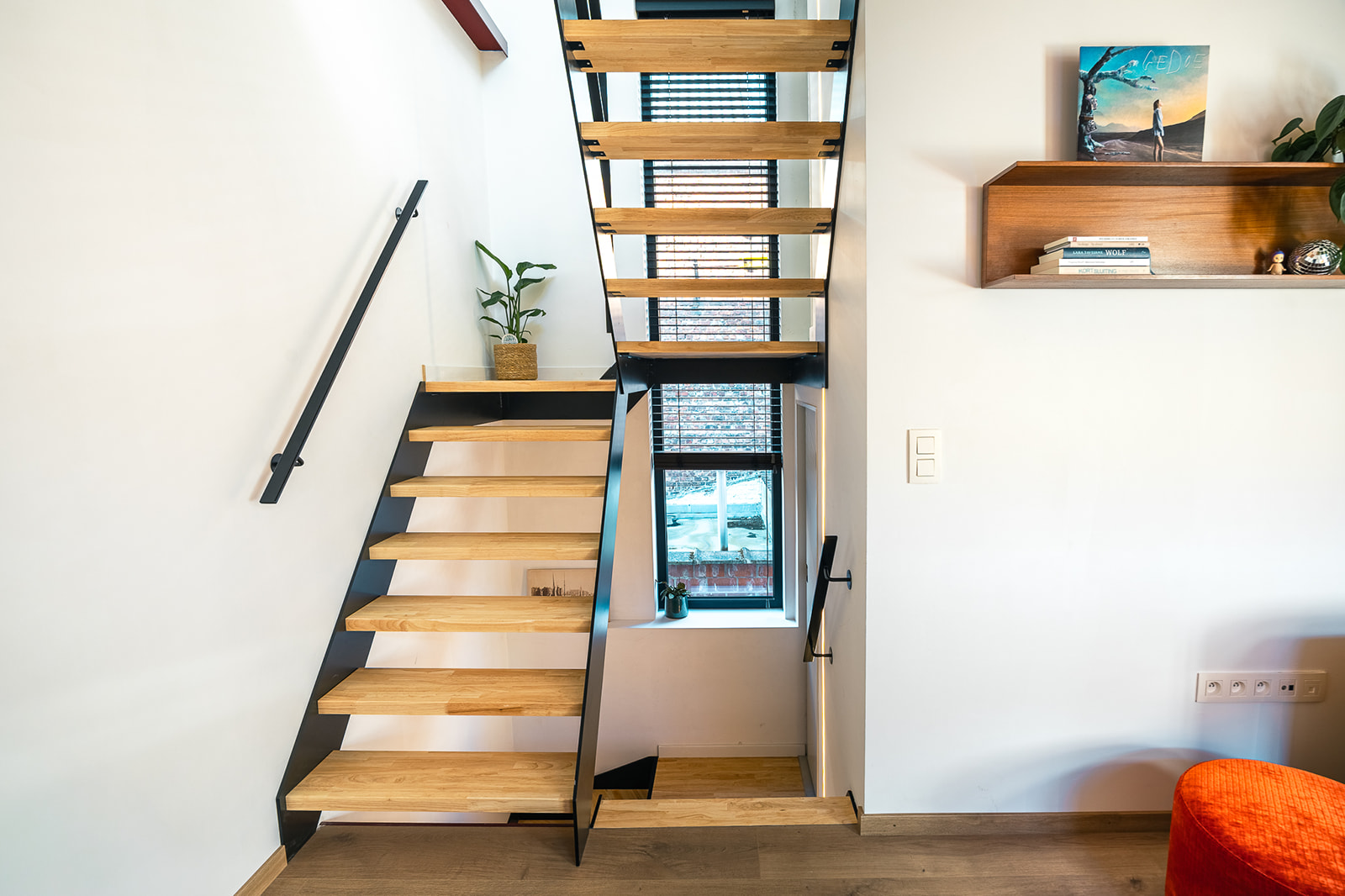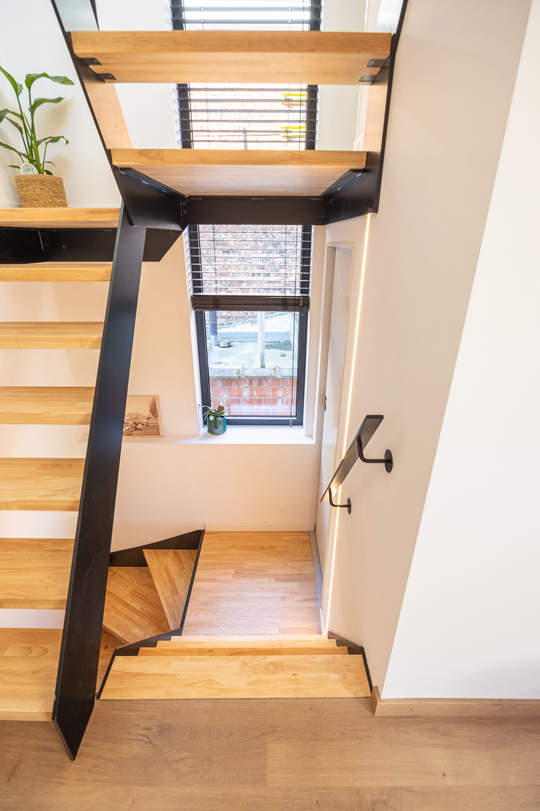 Een nieuwe trap,gekoppeld aan een verticaal accentraam, sluit aan op de splitlevels die zo in het huisje gecreëerd worden.