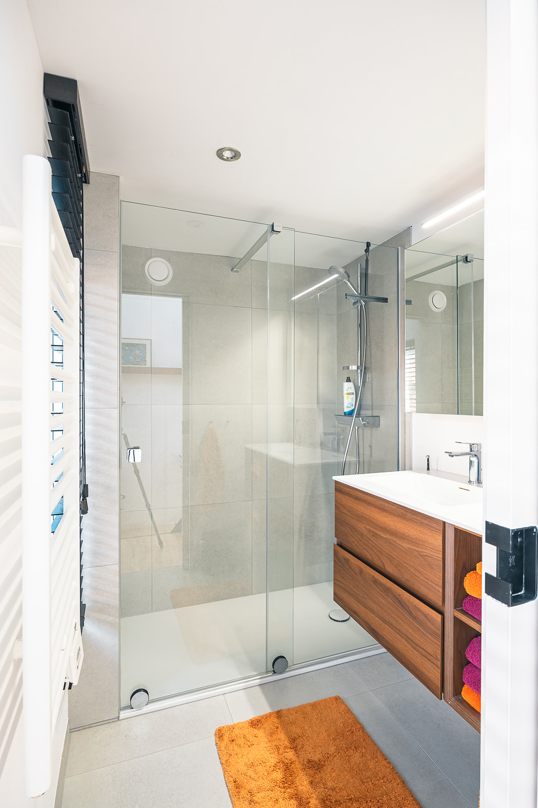 Hiervoor wordt er een ‘verticaal blokje’, ingeschoven. In dit volume krijgen alle sanitaire functies een plaats zodat elk van die functies zijn eigen privacy kent, en de rest van de