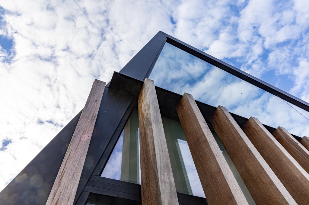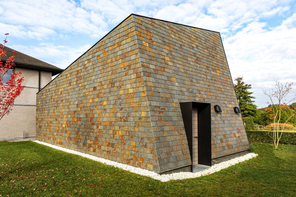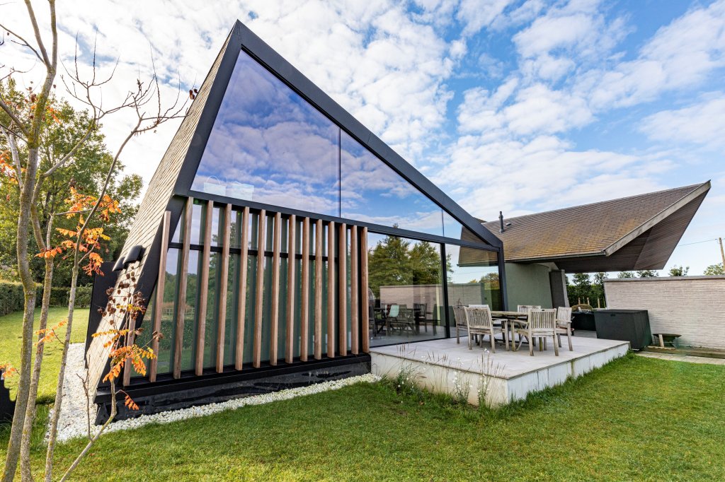 We bekomen een compact volume, dat resulteert in duurzaam materiaalgebruik. Dat komt de akoestiek ten goede. Deze ‘schuine’ houten bouwvolumes zorgen voor een hedendaagse uitstraling, die een positief contrast vormt met de bestaande woning, gebouwd op ‘traditionele wijze’.