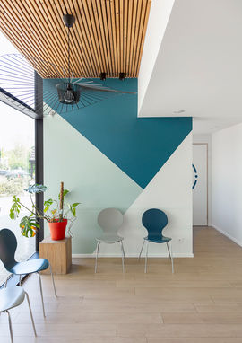 Door de praktijkruimte volledig op het gelijkvloers te voorzien, zorgen we voor een drempelloze toegankelijkheid voor patiënten. Een accentuitbouw met stalen portiekstructuur toont duidelijke de publieke functie in het straatbeeld. Deze omvat eveneens de helling om het niveauverschil met het maaiveld op een elegante manier te overbruggen. De wachtzaal is een beglaasd volume, waardoor de bezoekers in het groen kunnen plaatsnemen. Door de houten bekleding binnen-buiten te laten doorlopen wordt het parkgevoel in de wachtzaal extra versterkt.