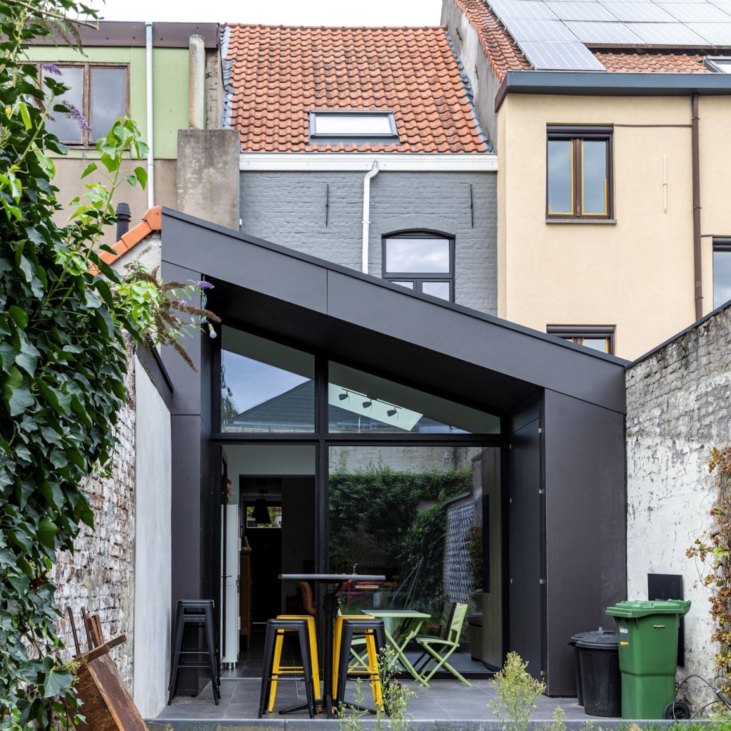 Achteraan de woning vinden we de zitplaats en een keuken met geïntegreerde eetplaats, badend in het licht met zicht op de charmante stadstuin. Het opvallende spits-hoekige raam is enerzijds een verwijzing naar het vroegere dak, anderzijds geeft het de woning een eigen karakter.
